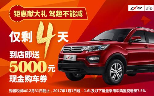 霸气的颜值,巨大的空间,丰富的配置,足以体现长安汽车以用户为本、为用户负责的企业良心和责任心。长安CX70绝对是10万级以下的SUV首选,年底了,很多朋友们都想购置辆新车回家过年,现为了回馈新老客户,长安CX70到店即享5000元现金购车券,同时享受购置税减半3000元,个贷免息3000元,置换补贴3000元。这么大幅的优惠,长安也是下了血本,并且只剩下4天时间了,过了就不能享受优惠。不想错过机的朋友们快去抢购吧!