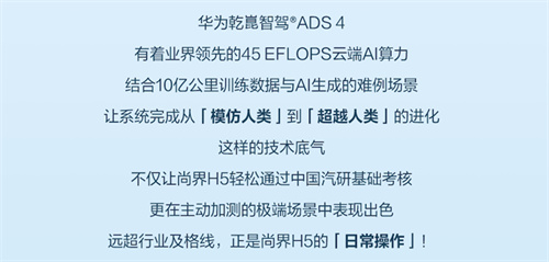 在这场测试中,鸿蒙智行旗下车型尚界H5取得了满分成绩。值得注意的是,该车型在华为乾崑智驾ADS 4系统的支持下,主动提升了测试难度,在七大复杂场景中均顺利完成挑战,展现出较强的系统冗余与场景适应性。